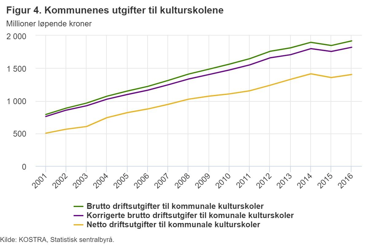 Figuren vi gjengir sammen med denne nyhetssaken er henta fra SSB-artikkelen og viser utviklingen av kommunens kostnader til kulturskolene i perioden 2001-2016, i løpende kroner.