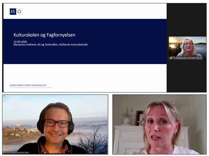 På nettmøtetet innledet spesialrådgiver Marianne Lindheim fra KS og rådgiver Torkel Øien fra Norsk kulturskoleråd/KS om fagfornyelsen og helhet og sammenheng i oppvekstfeltet.