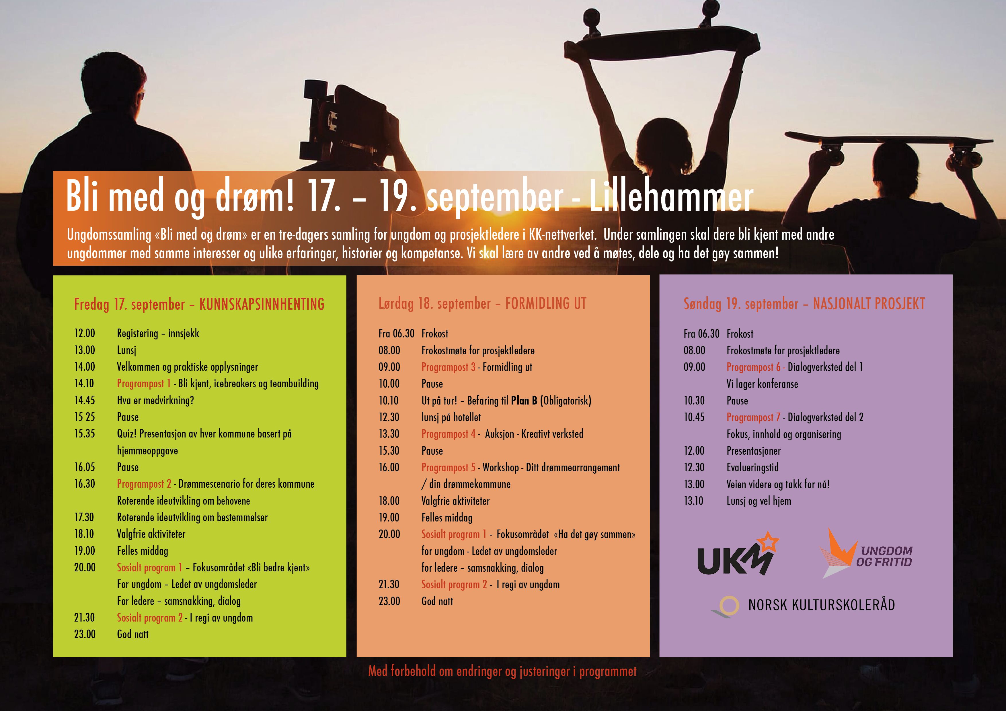 Arrangørene har også en plan om at det skal produseres en kortfilm under samlingen. Deltakerne skal videre på befaring til ungdomsklubben Plan B i Lillehammer. Og det planlegges et variert og godt sosialt program, med blant annet jamming, dans og scenetrening.