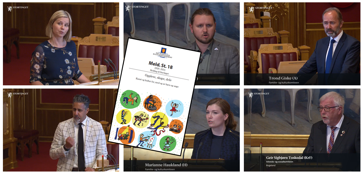 Mandag 7. juni debatterte to statsråder og 13 stortingsrepresentanter barne- og ungdomskulturmeldinga i drøye 100 minutter, og kulturskolen var tema i flere runder. Både kunnskapsminister Guri Melby og kulturminister Abid Raja (begge Venstre) var på talerstolen med innlegg og begge fikk flere replikker fra stortingsrepresentanter som krevde svar.