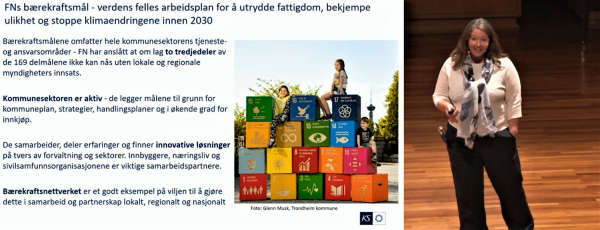 Kommunenes arbeid med å realisere bærekraftsmålene ved Kristin Holm Jensen, avdelingsdirektør for oppvekst, kultur og utdanning, KS. Her hoppa KS-kollega Anne Romsaas (bildet t.h.) inn som reserve for Holm Jensen. Romsaas er fagsjef i KS FID Stab (Forsking, innovasjon og digitalisering).