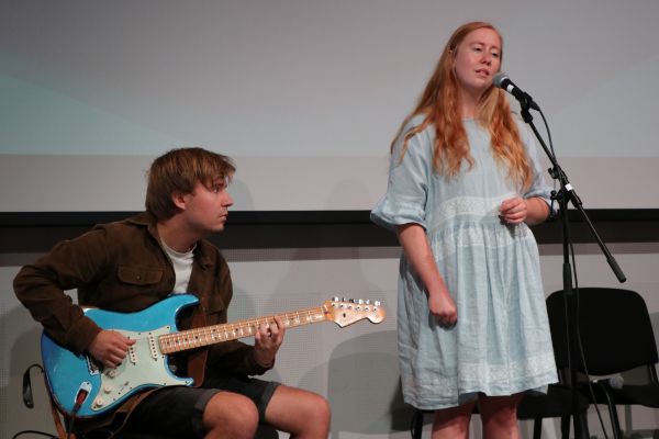 Tuva Senum og Marcus Waters leverte et kunstnerisk innslag før onsdagens debatt. Tuva er en av årets drømmestipendvinnere.