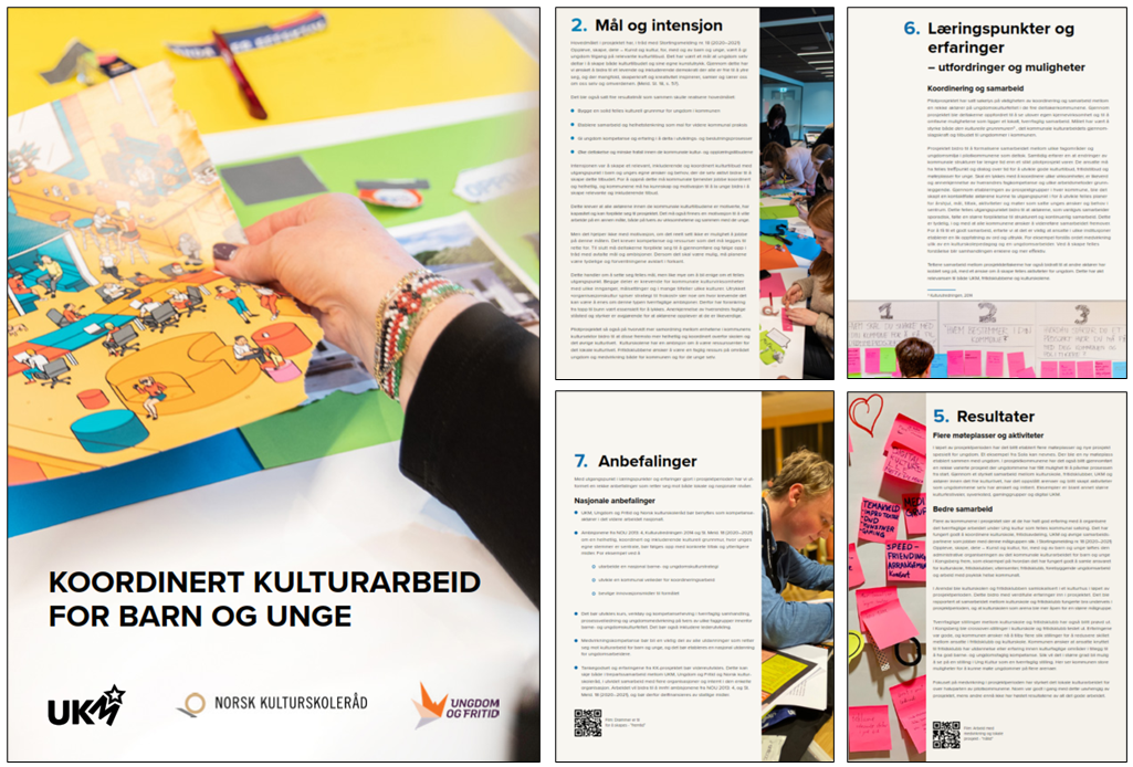 Rapporten presenter erfaringer og anbefalinger fra prosjektet Koordinert kulturarbeid som ble initiert i 2020 av UKM Norge, Ungdom og fritid og Norsk kulturskoleråd. Prosjektet har, gjennom et omfattende arbeid i fire pilotkommuner (Arendal, Kongsberg, Melhus, Sola), søkt svar på hvordan helhetstenkning, tverrfaglighet og ungdomsmedvirkning styrker og forbedrer kulturtilbudet.