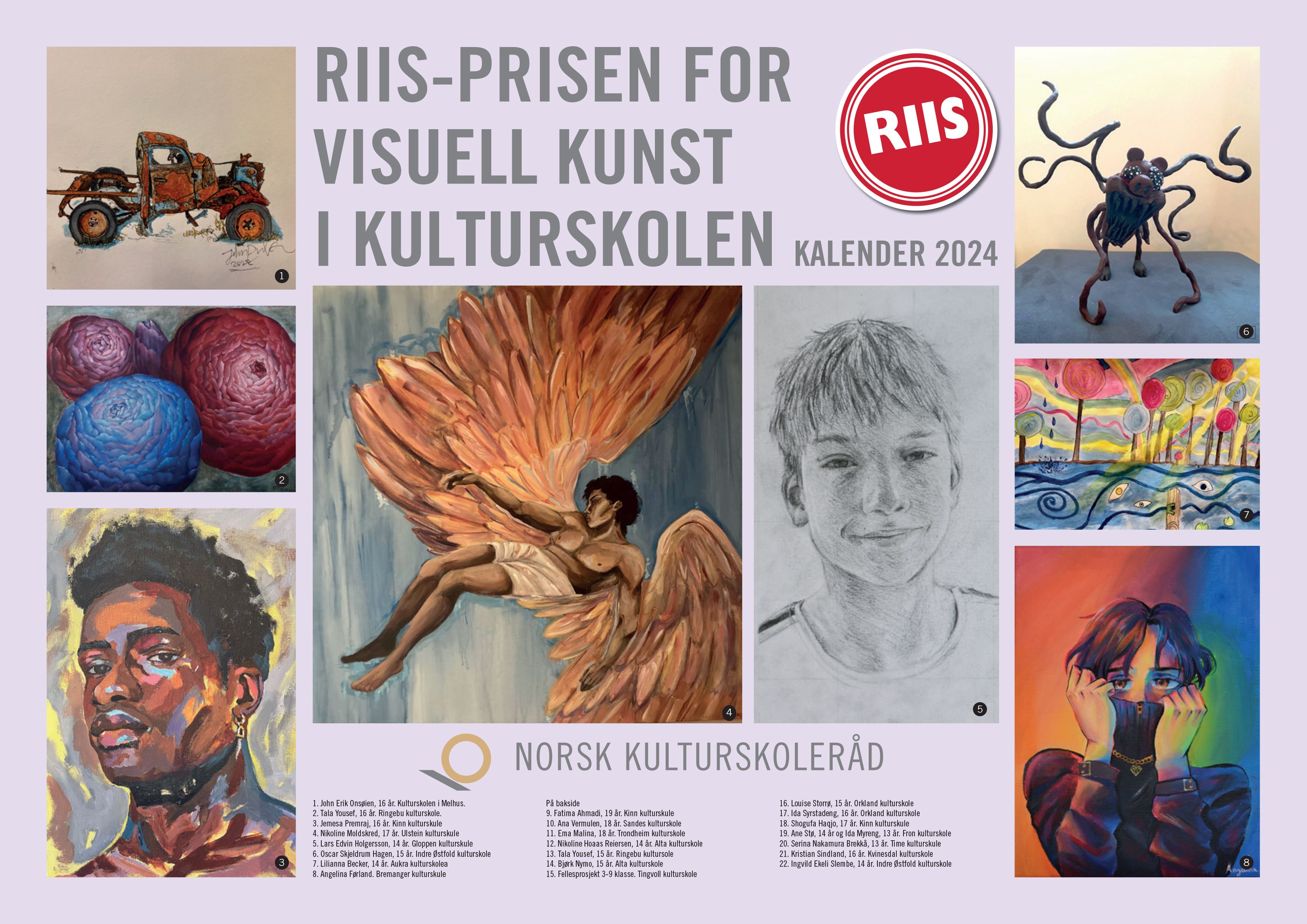 Mange fine kunstarbeider ble innsendt til konkurransen Riis-prisen 2023. Nå blir 46 av disse bidragene med i en Kulturskolekalender for 2024. Kalenderen sendes gratis til alle kommunale kulturskoler hjemmehørende i Norsk kulturskoleråds medlemskommuner.