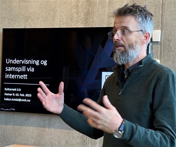 På samlinga holdt førstelektor Håkon Kvidal (bildet), Fagseksjon for musikkteori, komposisjon og musikkteknologi, Norges musikkhøgskole, en forelesning om undervisning og samspill via internett i sanntid.
