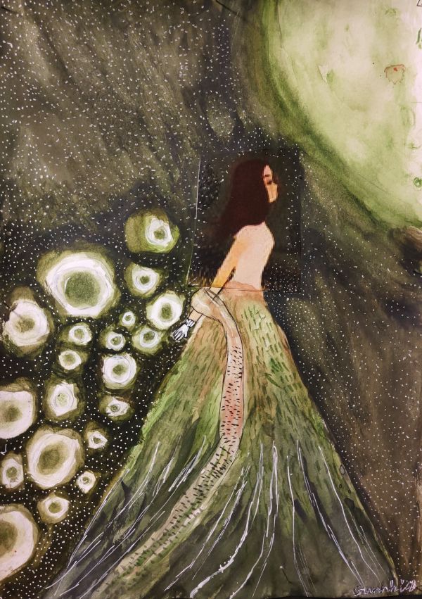– Dette verket blei til i eit prosjekt i kulturskulen der vi skulle velgje ut ein bit frå eit verk av Jane Newland og male vårt eige bilde ut frå det. Eg valde denne biten, fordi eg er veldig glad i å teikne og male mennesker. Eg har henta inspirasjon frå fantasy, sier Gunnhild.