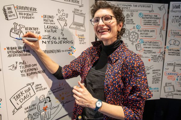 Illustratør Esther Buchmann dokumenterte møteinnholdet i illustrerende tegninger i storformat som ble presentert i sin helhet på tampen av møtet.