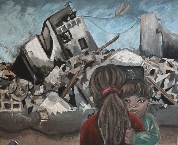 Sterkest er blikket fra barnet, foreløpig trygg i mammas armer, som ser rett på oss. Mennesker møter mye lidelser og urettferdighet, men vi finner også mye håp i omtanken. Maleriet er malt med gode penselstrøk og er godt komponert. God fargeharmoni som understreker stemningen i bildet.