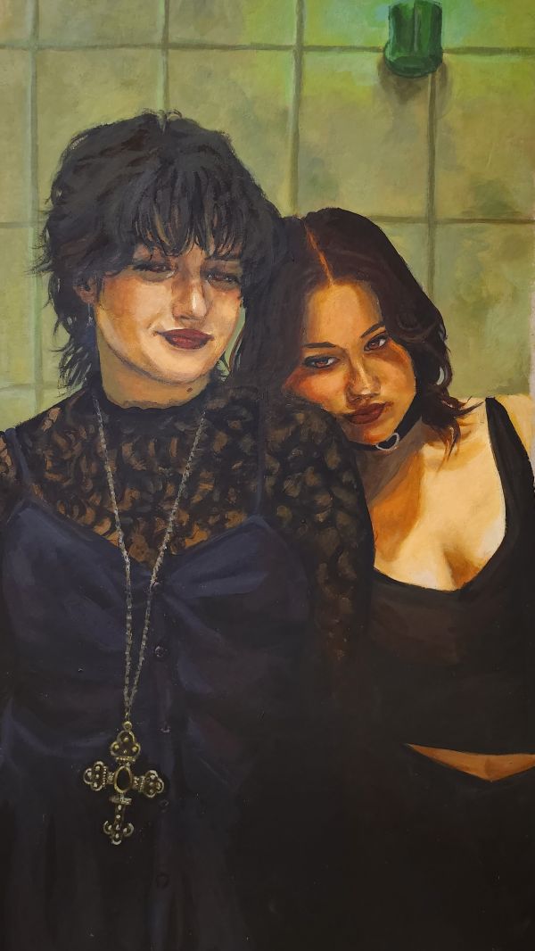 – Bildet er en gjenskapelse av en selfie jeg og min beste venninne tok i et speil på en halloweenfest. Det er det fineste bildet vi har av oss to, og derfor bestemte jeg meg for å male det. Prosessen var svært gøy, siden det er et av mine første helt egne malerier og jeg fikk friheten til å både endre og legge til detaljer, sier Emma.