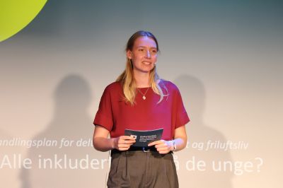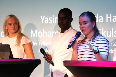 Etterpå fikk vi høre hvordan Tea Frøyland, Yasir Mohamed og Ida Haugen Skulstad (bildet) opplevde å delta i innspillsprosessen. Og igjen fikk publikum høre om viktigheten av at ungdom får medvirke når det er politiske saker som handler om dem. Og da ikke bare ungdom som allerede er "innafor", altså med på aktiviterer. Det ble understreka at det er viktig at ungdom som ikke deltar på aktiviteter, blir tatt med på råd og lytta til.
