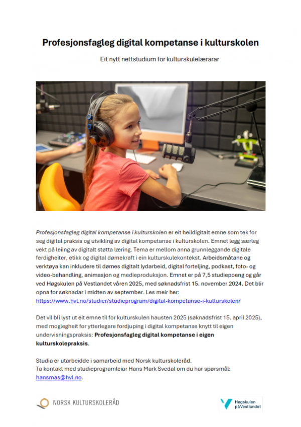 I samarbeid med Norsk kulturskoleråd har Høgskulen på Vestlandet utarbeidet studiet Profesjonsfagleg digital kompetanse i kulturskolen. Emnet tilbys som nettstudium ved høgskolen våren 2025. Søknadsfrist: 15. november 2024.
